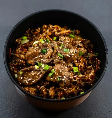 Состав: Рис, куриное филе перец болгарский, морковь, грибы шампиньоны, горошек зеленый, масло растительное, соевый соус, масло кунжутное, лук зеленый, кунжут жареный.